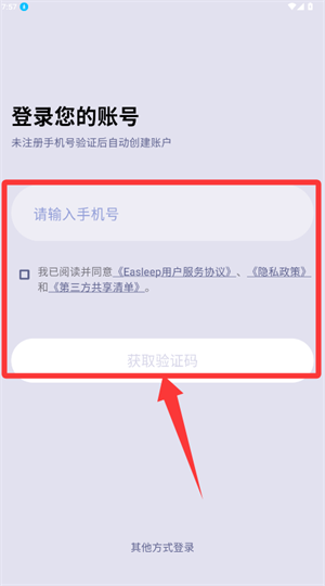 1、在登录界面输入手机号并勾选同意协议,点击获取验证码登录。