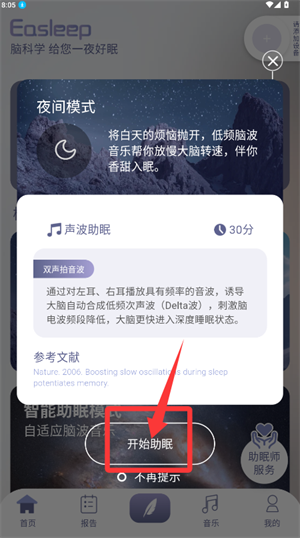 3、在夜间模式点击开始助眠,即可启动声波助眠功能。