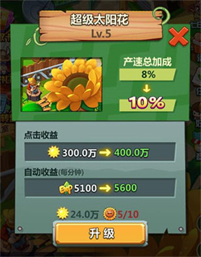 另外升级超级太阳花,消耗一定阳光和太阳花笑脸,也可以直接提升阳光产速的总加成。