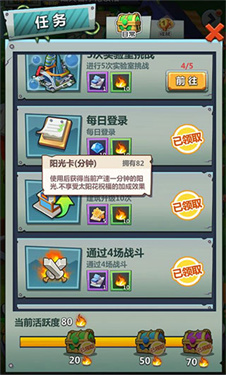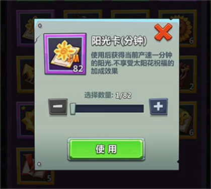 此外,游戏中还有一种道具──阳光卡,使用阳光卡可以直接获得在以上条件下一段时间内的阳光。