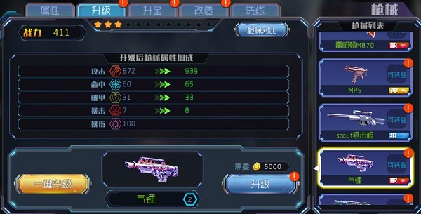 随着玩家等级的提高,遭遇的挑战也越来越危险,枪支升级系统,可以提高武器威力,帮助玩家战胜敌人。通过日常任务的金币进行升级,使用任务奖励的碎片进行强化,让爱枪紧紧跟随你成长的步伐