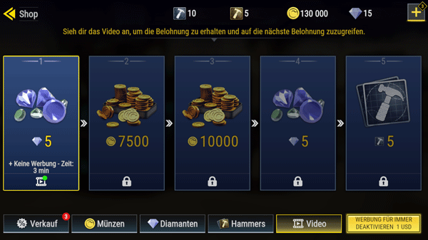 每日在商店内观看全部广告,最高可领取22,500金币奖励。