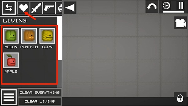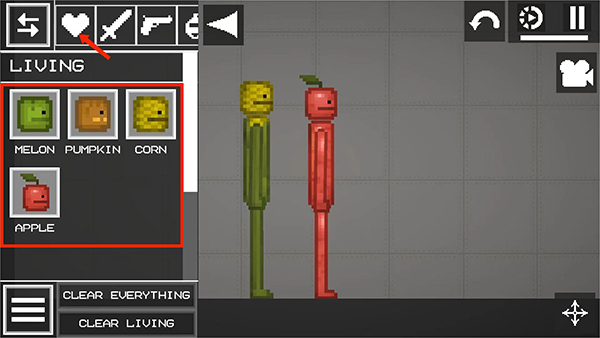 5、点击【爱心】图标,即可选择西瓜人、南瓜人、玉米人等角色,拖拽至地面放置,