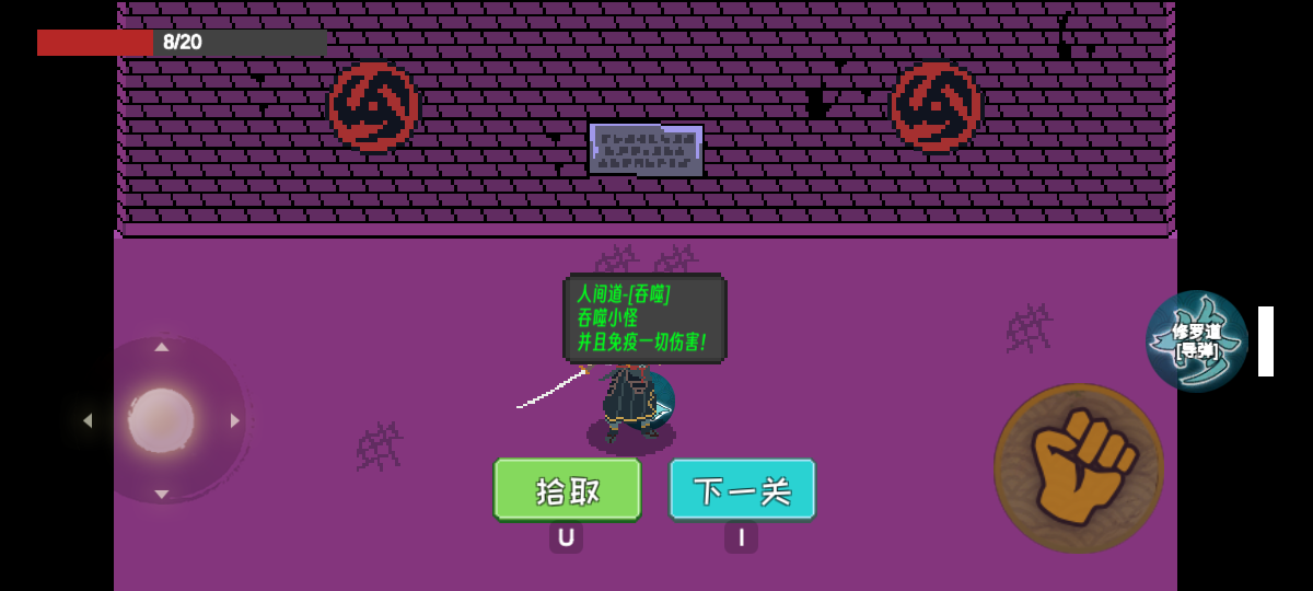 像素火影漂泊佩恩测试版是由B站创作者秦无邪OvO独立打造的一款像素风格冒险闯关游戏。在本作中,玩家将操控《火影忍者》中人气颇高的角色漂泊佩恩,挑战一系列精心设计的关卡,每个关卡都设置了独特的障碍与敌人,不仅考验玩家的操作精准度,还需灵活运用策略破解各类谜题。随着游戏不断推进,玩家将逐步解锁全新技能与能力,享受更加多元且富有深度的游戏体验。