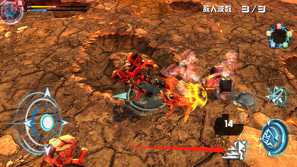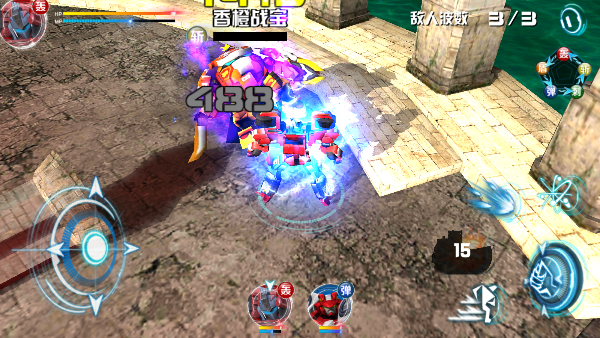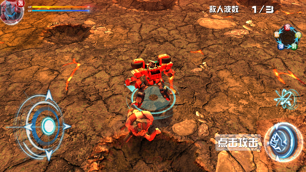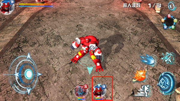 2、第一关中,左侧虚拟摇杆用于控制角色移动,右侧为普通攻击按钮,右上角则设有变身功能键,关键时刻可激活机甲形态。