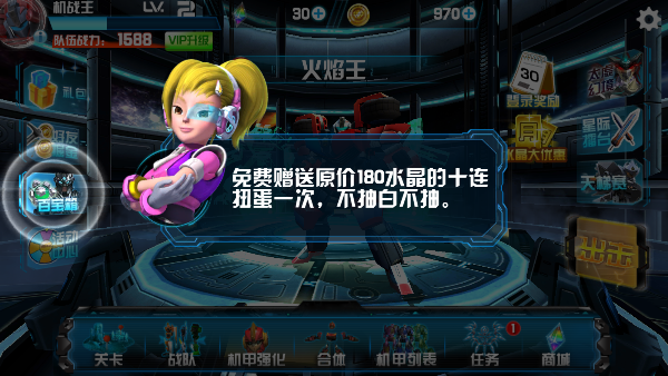 4、顺利通关第一关后,返回主界面进入“百宝箱”,即可免费抽取一次扭蛋,获取随机机甲或装备奖励。